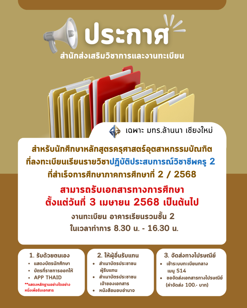 รับเอกสารทางการศึกษา สำหรับนักศึกษาหลักสูตรครุศาสตร์อุตสาหกรรมบัณฑิต ที่สำเร็จการศึกษาภาคการศึกษาที่ 2 / 2568